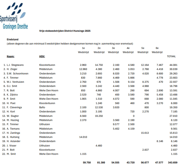 Ondanks de barre omstandigheden meldden zich maar liefst tien deelnemers voor de laatste vrije-stekwedstrijd van District Hunsingo. Het regende pijpenstelen en er stond een stevige wind. Gelukkig kwam de wind eerst uit het zuiden tot zuidwesten, waardoor we weinig last hadden aan het Winsumerdiep. In het laatste anderhalf uur trok de wind aan, draaide naar het noordwesten en werd het lastig vissen. De vangsten waren redelijk, met veel kleine vis — ook aan de feeder.