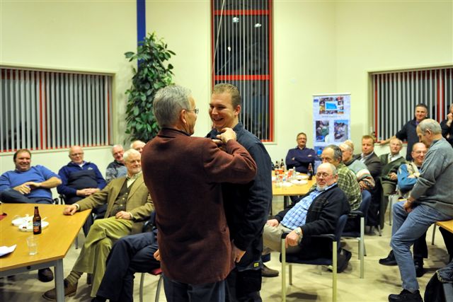Federatievoorzitter Herman Dirks speldt het eremetaal op bij Maurice Land.