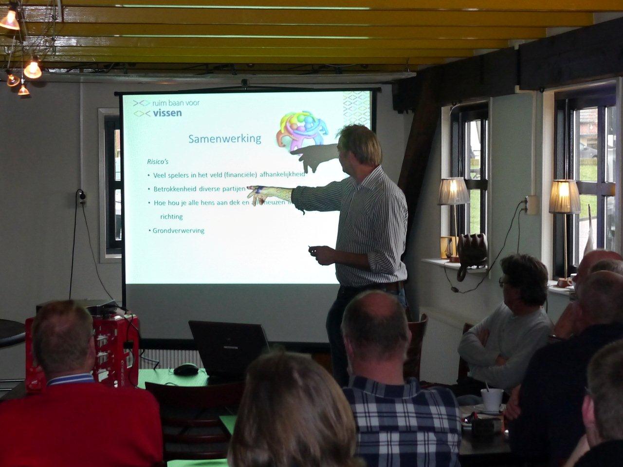Johan Hager, projectleider van Ruim Baan voor Vissen vanuit Wetterskip Fryslân, beet deze middag de spits af en gaf een inkijkje in de organisatie van het project. Hoewel het visaanbod-onderzoek qua kosten maar een bescheiden onderdeel vormt van de vele miljoenen die in het kader van Ruim Baan voor Vissen worden ingezet voor het oplossen van vismigratieknelpunten, is het onderzoek uniek vanwege de inzet van de tientallen vrijwilligers uit allerlei organisaties én de grote media-aandacht die het oplevert.